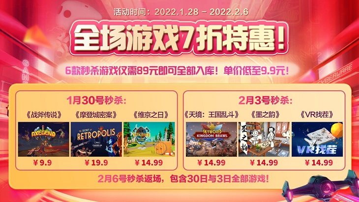 “奇遇商店新年促銷活動(dòng)”,為期12天,從1月28日持續(xù)至2月8日。屆時(shí)奇遇商店內(nèi)全部游戲7折優(yōu)惠,其中包括《多合一運(yùn)動(dòng)》、《危機(jī)行動(dòng)隊(duì)2》、《亞利桑那陽光》等玩家耳熟能詳?shù)臒衢T大作,此外,還有6款游戲參與限時(shí)特價(jià)活動(dòng),包括肉鴿塔防類游戲《戰(zhàn)斧傳說》限時(shí)特價(jià)9.99元、多人對戰(zhàn)卡牌游戲《天境:王國亂斗》限時(shí)特價(jià)14.99元;VR冒險(xiǎn)解密游戲《摩登城密案》限時(shí)特價(jià)19.99元。