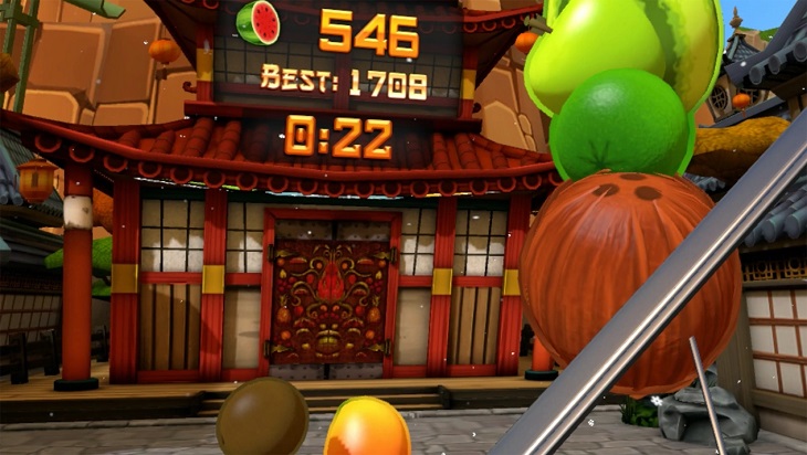 游戲中,玩家將進入水果忍者的庭院道場,唯一的任務就是爆砍360度環(huán)繞身旁的水果(老規(guī)矩:勿砍炸彈),用精湛的忍術(shù)刀法躋身全球排行榜之巔!《水果忍者VR》依舊秉承了“拾起即玩”的游戲特性及酣暢的刀鋒體驗,無論男女老少瞬間化身終極忍者,用手中利刃砍菜切瓜。但與手游版不同的是,《水果忍者VR》支持雙刀模式,結(jié)合VR手柄上的震動反饋,更有手握忍者刀的快感。