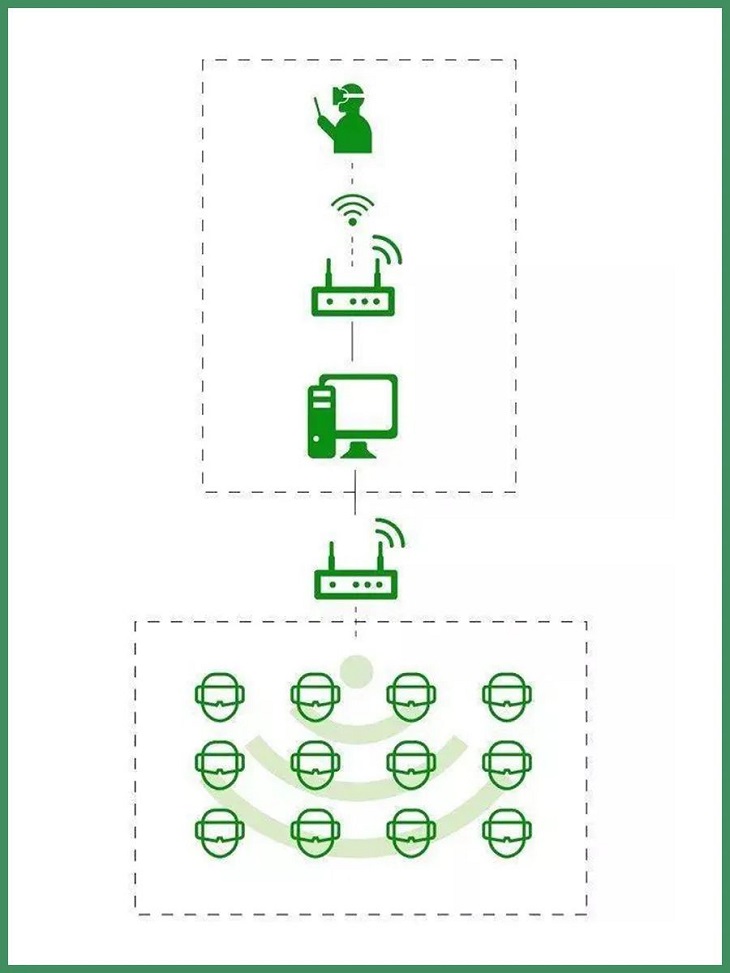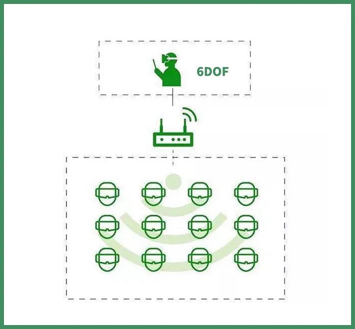 然而這種模式對硬件設(shè)備要求較高,同時對活動范圍也有一定的限制。因此Nibiru睿悅借助Nibiru Creator 6DoF版再度革新多控技術(shù),省去PC端設(shè)備,操作者可以通過 6DoF版的VR一體機進行操作,然后通過路由器直接推流到觀察者的VR一體機(3DoF版、6DoF版均可),不僅實現(xiàn)了6DoF操作的沉浸感體驗,還可以將場景應(yīng)用的設(shè)備需求降低一個維度,實現(xiàn)VR場景應(yīng)用的極簡主義。