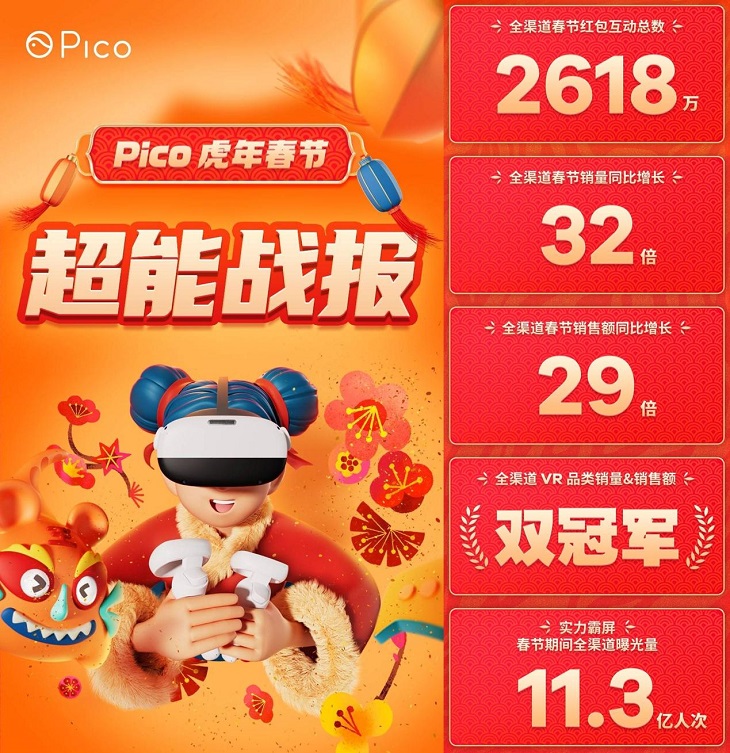 開春虎年旺,Pico開門紅打響新年第一炮,近日Pico官方正式公布了其2022年春節(jié)傳播及銷量戰(zhàn)報,2022.1.31至2022.2.7春節(jié)期間,Pico實力霸屏,全渠道優(yōu)惠券領(lǐng)取總量2618萬張,全渠道總曝光量更是達到了11.3億人次。春節(jié)流量帶來了銷售紅利,在這期間,Pico全渠道春節(jié)銷售量同比增長32倍,成交額同比去年春節(jié)增長29倍,榮獲全渠道VR品類銷量&銷售額雙冠軍,銷售成績接連創(chuàng)造佳績。