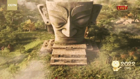 《金面》整個舞臺與720度屏幕融合在一起,呈現(xiàn)出極具沉浸感的無邊界舞臺,在這里虛實的界限被打破,觀眾也像踏入「三星堆」神秘文明之中,由數(shù)字建模構(gòu)建的虛擬還原場景栩栩如生,無論是屏幕前還是現(xiàn)場觀眾,都被包裹這跨越千年的浪漫七夕中。