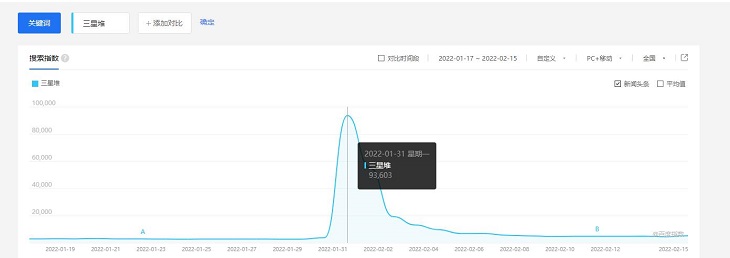 雖說春晚語言類節(jié)目最出圈的依舊是網(wǎng)絡(luò)段子,但不得不承認(rèn),歌舞類節(jié)目水準(zhǔn)又創(chuàng)新高。展示「三星堆」文物的舞蹈《金面》更是為三星堆本身帶來一波熱度,百度指數(shù)顯示,「三星堆」一詞的搜索量在除夕夜達(dá)到近一月的頂峰: