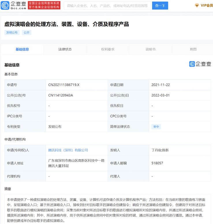 根據(jù)IT之家報(bào)道和企查查的資料,昨日騰訊科技 (深圳) 有限公司公開(kāi)了“虛擬演唱會(huì)的處理方法、裝置、設(shè)備、介質(zhì)及程序產(chǎn)品”專利,公開(kāi)號(hào)為 CN114120943A。