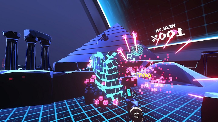 之所以推薦這款游戲,主要是因?yàn)槲蚁矚g這種像素風(fēng)VR游戲,它一方面打起來(lái)很爽,另一方面對(duì)于VR一體機(jī)的性能要求也不高,完全可以非常流暢運(yùn)行。在游玩過(guò)程中我發(fā)現(xiàn)武器的手感一般,但我可以通過(guò)射擊不同的buff方塊來(lái)獲得更強(qiáng)力的武器、恢復(fù)生命值或者開(kāi)啟子彈時(shí)間,這樣就保證了游戲的新鮮感和爽快感。
