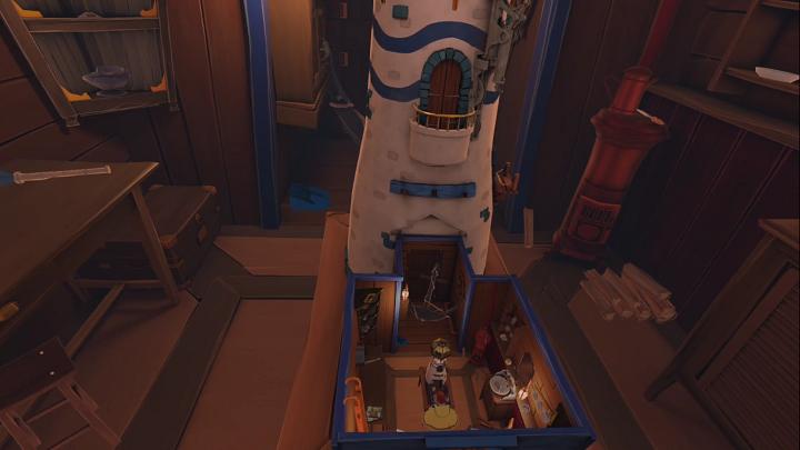 第二,極為精妙的謎題設(shè)計(jì)。游戲剛開(kāi)始的關(guān)卡是一個(gè)類(lèi)似于無(wú)限套娃的場(chǎng)景,你所在的房間里面有一個(gè)一模一樣的建筑模型,你可以看到里面的人物模型和你自己的動(dòng)作完全一致,而你的房間又是外面更大的一個(gè)空間里的模型,一些謎題則圍繞這個(gè)設(shè)定進(jìn)行展開(kāi)。比如你把從抽屜里找到的一頂帽子放在桌子上,然后就可以從模型里的對(duì)應(yīng)位置上得到一頂小尺寸的帽子…類(lèi)似的解謎線索這里就不過(guò)多劇透了。