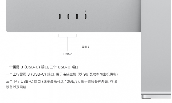 接口方面,Studio Display擁有三個USB-C端口,方便用戶連接網(wǎng)絡(luò)以及外置硬盤、鍵盤、鼠標和iPhone 等設(shè)備,還能為這些外設(shè)供電或充電;其還擁有一個雷靂端口,讓用戶只需一根連接線便可將Studio Display與Mac相連,這個端口還能以96W的功率為兼容的Mac筆記本充電。一臺 MacBook Pro 最多可以同時連接三臺 Studio Display。