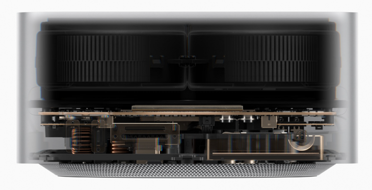 在Mac Studio僅有 19.7 厘米見方的機身中,蘋果還裝置了一套開創(chuàng)性的散熱系統(tǒng),包含雙離心風扇、精確放置的風道以及外殼背部和底部上的逾 4,000 個散熱孔,能夠引導(dǎo)氣流流經(jīng)內(nèi)部元件,幫助高性能芯片降溫,從而讓M1 Max 和M1 Ultra以極快的速度處理各種繁重任務(wù),同時保持靜默。