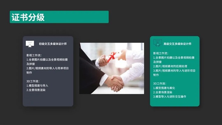 “交互多媒體設(shè)計(jì)師認(rèn)證”是一套專業(yè)化、科學(xué)化、系統(tǒng)化的人才認(rèn)證培訓(xùn)標(biāo)準(zhǔn),分為初級(jí)交互多媒體設(shè)計(jì)師以及高級(jí)交互多媒體設(shè)計(jì)師,涉及教育、醫(yī)療、辦公、工業(yè)、文旅等元宇宙場(chǎng)景應(yīng)用從業(yè)者所需要具備的技能,符合當(dāng)今元宇宙潮流,為各界企業(yè)、機(jī)構(gòu)提供交互多媒體設(shè)計(jì)人才參照標(biāo)準(zhǔn)。