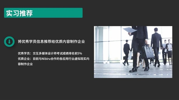 實(shí)習(xí):將優(yōu)秀學(xué)員信息推薦給優(yōu)秀內(nèi)容制作企業(yè),完成人才供需市場(chǎng)的無(wú)縫銜接。