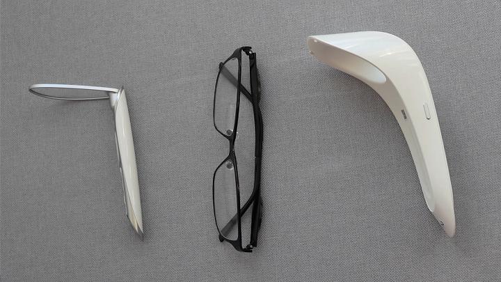 先說外觀,一套完整的OPPO Air Glass其實包含三個部分:眼鏡主體、配套使用的鏡框和充電座。用戶在使用時可以將眼鏡主體吸附在鏡框上的磁吸片上,使用完畢后再將眼鏡主體連接充電座進行充電。