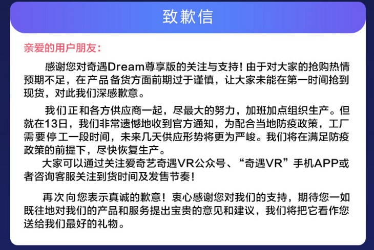 當(dāng)一個(gè)產(chǎn)品真的出了圈,流量也真的大到嚇人。奇遇官方旗艦店門(mén)檻快被踩塌了,預(yù)約開(kāi)啟后不到一小時(shí),預(yù)約量超過(guò)4萬(wàn),隨后沒(méi)多久,這一數(shù)值就突破了10萬(wàn),而此刻,預(yù)約量還在快速增長(zhǎng)。這甚至超出了官方對(duì)于這次活動(dòng)的預(yù)期,期間每周幾次補(bǔ)貨,但每次都是秒空,無(wú)底洞一樣。這中間有個(gè)插曲也不得不提一嘴,因?yàn)橐咔橛绊懝S生產(chǎn),奇遇官方在庫(kù)存不是很充裕的情況下,屢次補(bǔ)貨即售空的場(chǎng)景,也被少數(shù)用戶(hù)質(zhì)疑詬病為“饑餓營(yíng)銷(xiāo)”,以至于官方不得不站出來(lái)道歉。要知道VR 行業(yè)因供不應(yīng)求到被用戶(hù)吐槽,這還是頭一遭。