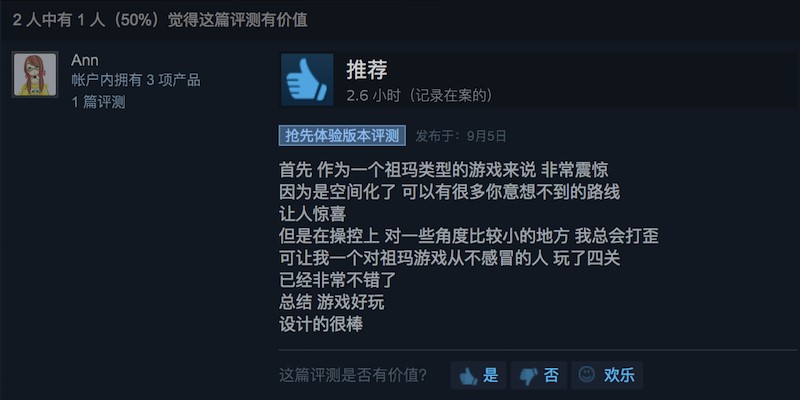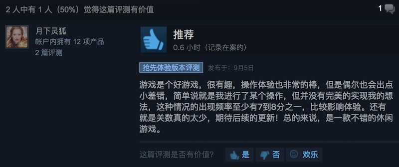 對于本作,我們先看看玩家的評論吧。截止到今天,Steam平臺(tái)對于本作的評測一共有15篇,其中全部是好評。都說玩家的眼睛是雪亮的,下面我截取了幾段玩家的評論。