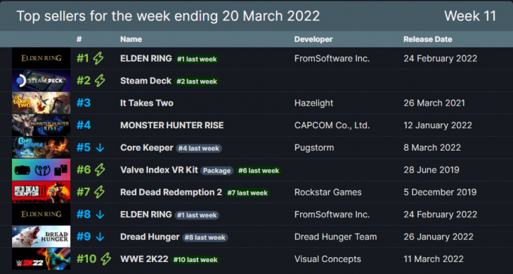 日前,Valve公布了上一周(2022年3月14日-20日)的Steam平臺銷量排行榜,F(xiàn)rom Software新作、宮崎英高操刀的「艾爾登法環(huán)(Elden Ring)」依然高居榜首,拿下四連冠。Valve開發(fā)的掌機Steam Deck延續(xù)上周走勢,仍然位居第二?!鸽p人成行」與「怪物獵人:崛起」再度殺入榜單位列三、四位。