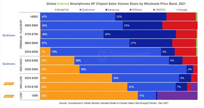 著名市場(chǎng)調(diào)研機(jī)構(gòu)Counterpoint表示,在2021年全球Android智能手機(jī)芯片組份額分析報(bào)告中,高通憑借驍龍7系和8系芯片組持續(xù)引領(lǐng)中高端市場(chǎng)。在中高端(300-499美元)的智能手機(jī)細(xì)分市場(chǎng),高通占據(jù)了高達(dá)65%的份額,較2020年的53%增長(zhǎng)明顯。