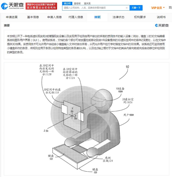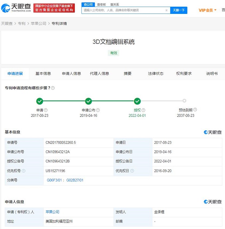 天眼查顯示,蘋果公司獲“3D文檔編輯系統(tǒng)”專利授權(quán),申請(qǐng)日期為2017年8月23日,授權(quán)日期為2022年4月1日。