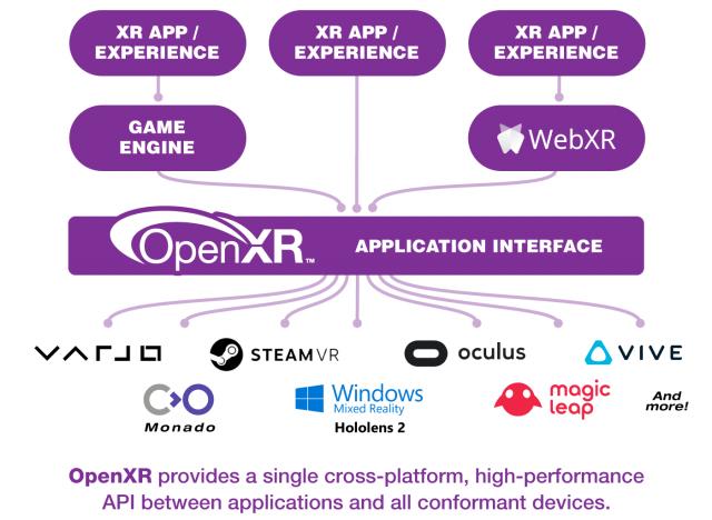 OpenXR是XR行業(yè)標(biāo)準(zhǔn),旨在標(biāo)準(zhǔn)化XR應(yīng)用程序的開(kāi)發(fā),使相關(guān)硬件和軟件互相兼容,理想情況下,一款OpenXR兼容應(yīng)用可以在任何支持OpenXR的頭顯上運(yùn)行,而無(wú)需更改低底層代碼。