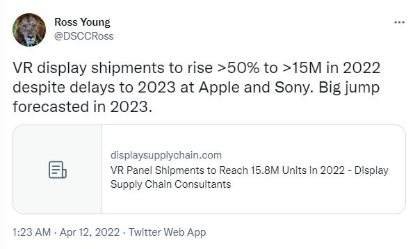 據(jù)UploadVR報(bào)道,DSCC首席執(zhí)行官、顯示器供應(yīng)鏈分析師Ross Young認(rèn)為PSVR 2和蘋果AR/VR頭顯將推遲到2023年發(fā)布。