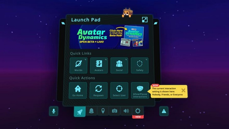 此外,“Avatar Dynamics”更改了快捷功能菜單,以全新的“Avatar Dynamics”功能按鈕取代了“Emoji ”按鈕,基于該按鈕用戶可快捷設(shè)置該系統(tǒng)的啟用/關(guān)閉,玩家還能更改系統(tǒng)交互規(guī)則,使交互系統(tǒng)僅對(duì)某人或所有交互對(duì)象而進(jìn)行特殊設(shè)置。