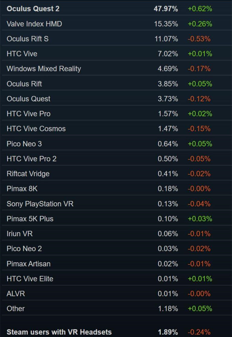 據(jù)UploadVR報道,4月Steam硬件和軟件調(diào)查報告顯示,Meta Quest 2占有率達(dá)到47.97%,增長0.62%,另外,自3月Valve Index采用增長(+0.66%)超過了Quest 2(+0.27%)之后,4月,Valve Index占有率繼續(xù)增長,為15.35%。