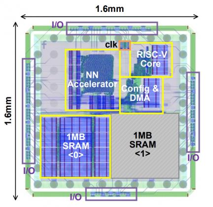 “該測試芯片采用7nm技術(shù)節(jié)點制造,具有神經(jīng)網(wǎng)絡(luò)(NN)加速器,由1024乘積(MAC)陣列、2MB片內(nèi)SRAM和32位RISC-V CPU組成。”
