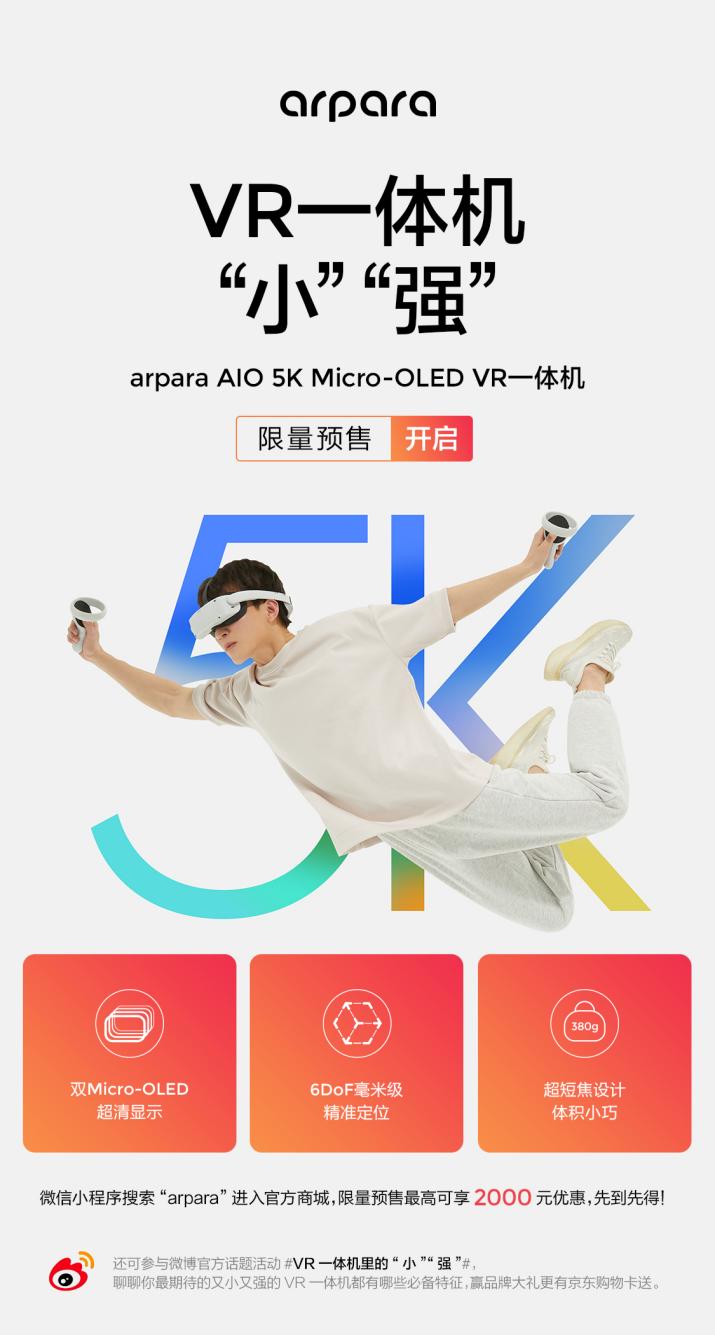 最新消息,去年推出全球第一款基于Micro-OLED 技術(shù)VR頭顯的國(guó)內(nèi)廠商arpara今天在其官方微博宣布旗下一體機(jī)arpara AIO 5K VR一體機(jī)國(guó)內(nèi)限量預(yù)售正式啟動(dòng)。據(jù)了解,這款VR一體機(jī)曾于去年年底登陸Kickstarter眾籌平臺(tái),不但收獲了海外媒體及玩家的廣泛好評(píng),還取得了相當(dāng)出色的銷售成績(jī),也吸引了國(guó)內(nèi)眾多科技媒體和玩家的關(guān)注。此次預(yù)售正式開啟官方就打出了這款一體機(jī)又“小”又“強(qiáng)”的性能優(yōu)勢(shì),引來(lái)VR愛好者們紛紛討論。