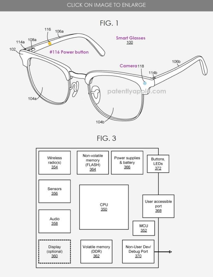 另外,據(jù)Patently Apple報道,谷歌最新智能眼鏡專利顯示,除了賦予眼鏡用戶所示視圖,還增加了將信息(例如,數(shù)字圖像)疊加至視場并基于例如光學頭戴式顯示屏(OHMD)、兼具透明頭戴式顯示屏(HUD)嵌入式無線眼鏡進行AR視圖覆蓋,總而言之,現(xiàn)代智能眼鏡實際上可以是運行獨立移動應用程序的可穿戴電腦,并能支持用戶通過免提、自然語言語音命令以及觸屏功能按鈕與互聯(lián)網(wǎng)通信。