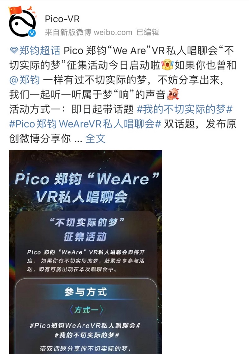 不僅如此,本場(chǎng)唱聊會(huì)將改變傳統(tǒng)演唱會(huì)“我唱你聽”的觀演方式,打造一次全新的星際“樹洞”唱聊空間,彈幕互動(dòng)貫穿全程。在唱聊會(huì)中,鄭鈞將講述自身故事,觀眾也可以通過彈幕分享出自己的故事,與鄭鈞進(jìn)行一次雙向交互治愈對(duì)話,真正做到VR唱聊與我有關(guān)。而在此前,Pico官方微博也發(fā)起了“我的不切實(shí)際的夢(mèng)”活動(dòng),收集網(wǎng)友、用戶的有關(guān)回答,其中的部分回答將有機(jī)會(huì)出現(xiàn)在唱聊會(huì)現(xiàn)場(chǎng),被鄭鈞看到和分享。