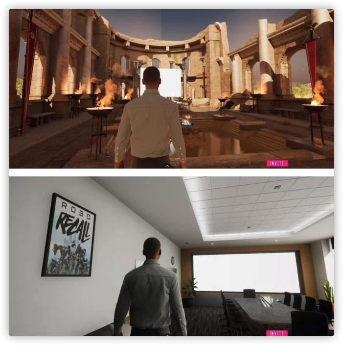 而在會(huì)議空間方面,「Detroit Lab」提供了古羅馬、現(xiàn)代辦公和濕地三大主題空間,每個(gè)虛擬空間都布置有長(zhǎng)桌和屏風(fēng),從而將虛擬會(huì)議與環(huán)境完美結(jié)合。