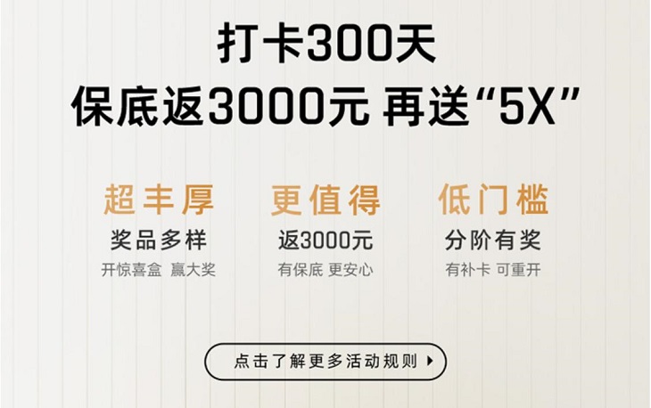 ?打卡300天:驚喜盒必得獎(jiǎng)勵(lì)為3000元購物卡,隨機(jī)獎(jiǎng)勵(lì)(可得其中1種)包括聯(lián)想拯救者筆記本電腦1臺、奇遇會(huì)員季卡1張、奇遇會(huì)員半年卡1張、奇遇商店游戲2款、奇遇商店游戲3款、奇遇定制玩偶公仔1個(gè)。