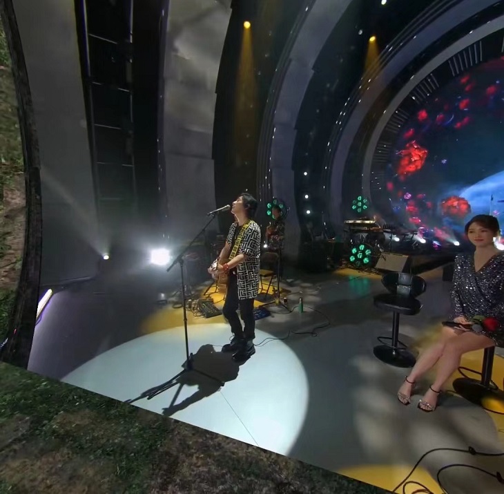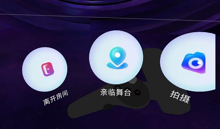 用戶可以通過(guò)扭動(dòng)手柄實(shí)現(xiàn)全自由度觀看視角,調(diào)整位置自我掌控觀看視角,自由調(diào)整與鄭鈞和舞臺(tái)之間的距離,體驗(yàn)多角度的觀看位置切換與互動(dòng)視角。更創(chuàng)新性增加了“親臨舞臺(tái)”視角,用戶點(diǎn)擊“親臨舞臺(tái)”按鍵即可來(lái)到舞臺(tái),實(shí)現(xiàn)“站在舞臺(tái)上面對(duì)面”聽(tīng)歌的體驗(yàn)。