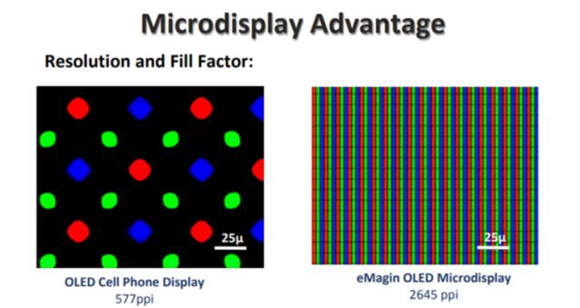OLED“微型顯示屏”的制造方式與智能手機(jī)或電視尺寸大小的OLED面板不同——直接安裝在硅片上,其導(dǎo)向結(jié)果為像素密度更高且尺寸更小,但通常而言,這種微型顯示屏的對(duì)角線為 1英寸或更小,因此很難在大視場(chǎng)角上發(fā)揮作用。