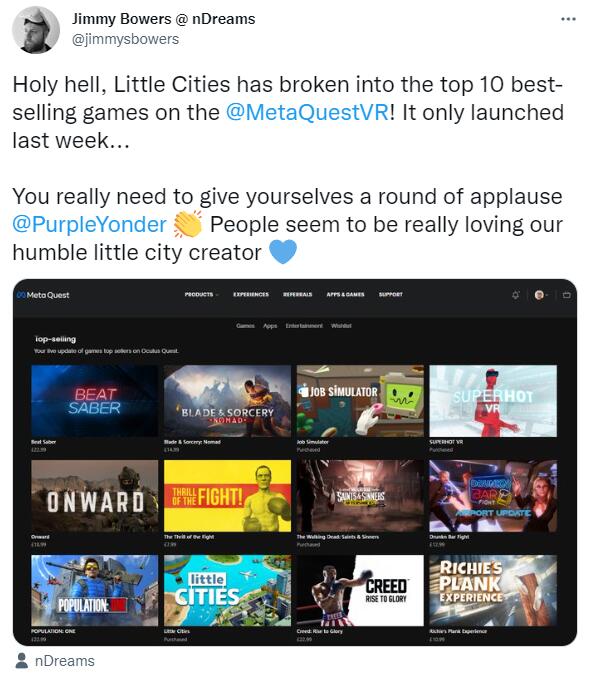 Quest Store暢銷榜按降序列實(shí)時(shí)更新商店最暢銷游戲,截至發(fā)稿,「Little Cities」在該榜單排第12名,但nDreams社區(qū)經(jīng)理Jimmy Bowers在推特證實(shí),「Little Cities」曾短暫排在了第10位。