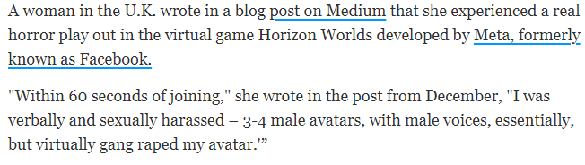 無獨有偶,在Meta的虛擬社交軟件Horizon World中,也有類似的事件。Horizon測試期間,有女子表示說在廣場上有三名男子對自己虛擬角色上下其手。據(jù)一些新聞報道顯示,這名女子并非個例,截止目前已經(jīng)有多起類似事件在Horizon中發(fā)生。
