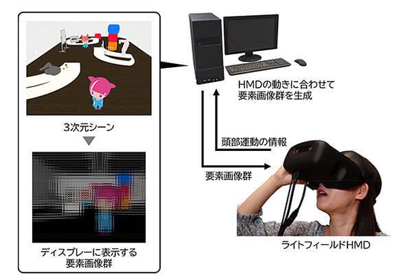 基于頭顯運(yùn)動(dòng),實(shí)時(shí)生成排列了小“要素圖像”的一組“要素圖像”將被顯示在顯示屏上,而通過“要素圖像”和透鏡陣列,“光場(chǎng)頭戴式頭顯”將能呈現(xiàn)3D場(chǎng)景中的光線,并如同現(xiàn)實(shí)世界一般,根據(jù)被攝體的深度位置,使用戶自主調(diào)整眼睛聚焦位置,從而減緩用戶視覺疲勞的同時(shí),實(shí)現(xiàn)更加自然的3D影像觀感。