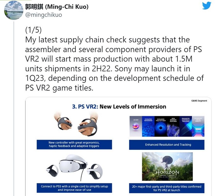 郭明錤推文表示,PSVR 2“組裝商和幾家組件提供商”將于2022年下半年開始批量生產(chǎn)PSVR 2,出貨量為150萬臺?;诖耍麇Z推測PSVR 2將于2023年第一季度推出。