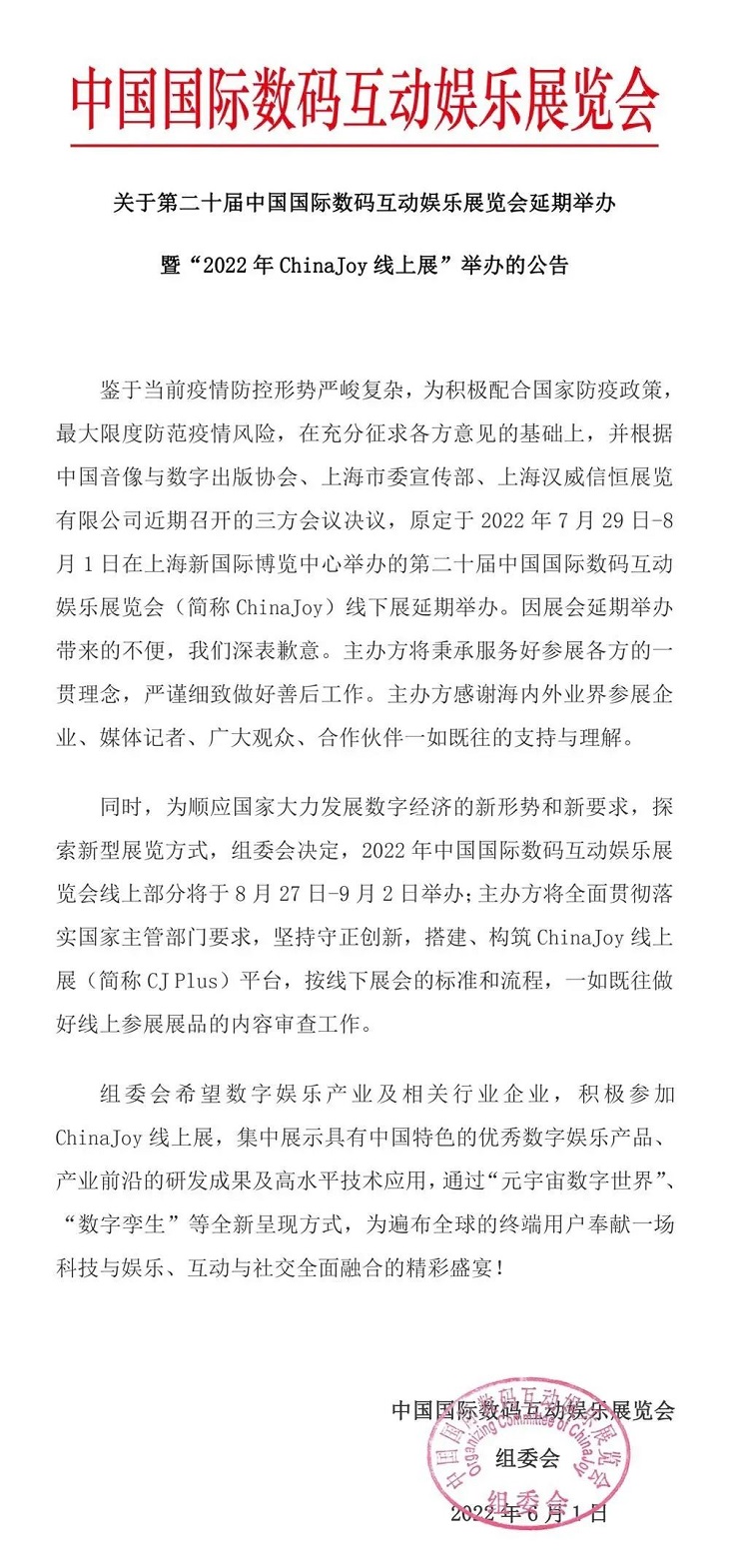 原定于7月29日-8月1日在上海新國(guó)際博覽中心召開的第二十屆中國(guó)國(guó)際數(shù)碼互動(dòng)娛樂展覽會(huì)(簡(jiǎn)稱ChinaJoy)線下展延期舉辦,同時(shí),為順應(yīng)國(guó)家大力發(fā)展數(shù)字經(jīng)濟(jì)的新形勢(shì)和新要求,探索新型展覽方式,組委會(huì)決定,2022年中國(guó)國(guó)際數(shù)碼互動(dòng)娛樂展覽會(huì)線上部分將于8月27日-9月2日舉行。