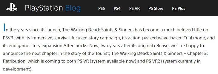 「行尸走肉:圣徒與罪人-第2章:報(bào)應(yīng)」即將登陸PSVR和PSVR 2平臺(tái),具體時(shí)間線為2022年底(PSVR)和2023年(PSVR 2)。