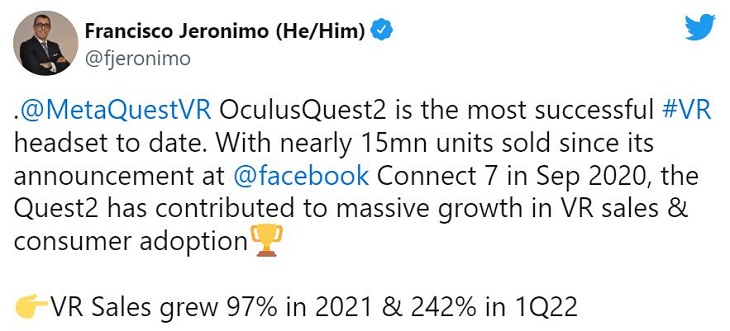 IDC的Francisco Jeronimo發(fā)表推文表示,Quest 2(上市20個月后)的銷量接1500萬臺,是“迄今為止最成功的VR頭顯”,并進一步聲稱,去年VR銷量增長了97%,今年第一季度增長了242%。