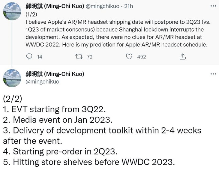 郭明錤推文稱,其預(yù)測了蘋果AR/VR頭顯各階段具體時(shí)間線。