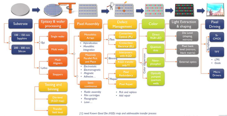 Micro LED尚處于研發(fā)階段,實(shí)現(xiàn)量產(chǎn)還存在較多的技術(shù)問(wèn)題需要解決。從技術(shù)角度上看,目前Micro LED工藝流程每一環(huán)節(jié)幾乎都面臨一定的技術(shù)難點(diǎn)亟待攻克,主要包括:外延技術(shù)、微縮制程技術(shù)、巨量轉(zhuǎn)移技術(shù)、缺陷檢測(cè)技術(shù)以及全彩化方案技術(shù)等。伴隨技術(shù)持續(xù)突破和制作工藝的不斷優(yōu)化,中金預(yù)計(jì)Micro LED有望在2025年實(shí)現(xiàn)初步量產(chǎn)。