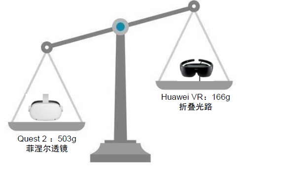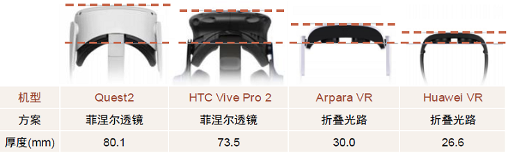 ? 特點(diǎn)#2:折疊光路實(shí)現(xiàn)頭顯設(shè)備輕薄化。對(duì)比市面上的主流VR頭顯產(chǎn)品,HTC Vive Pro 2和Oculus Quest 2采用菲涅爾透鏡方案,重量為785/503g,厚度為73.5/80.1mm;而Huawei VR Glass和Arpara VR采用折疊光路方案,重量為166/200g,厚度為26.6/30.0mm。搭載折疊光路方案的VR頭顯設(shè)備重量和厚度顯著低于搭載菲涅爾透鏡方案的產(chǎn)品。因此中金認(rèn)為,折疊光路技術(shù)的成熟將會(huì)顯著改善VR頭顯的佩戴舒適度。