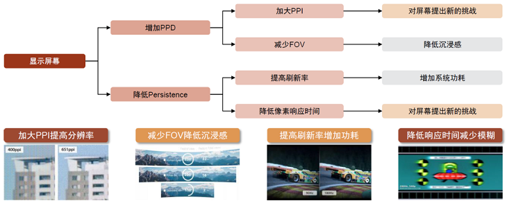 VR設(shè)備的顯示效果由三項(xiàng)核心參數(shù)決定,分別為視場(chǎng)角(FOV)、角分辨率(PPD)以及視覺(jué)暫留(Persistence)。其中顯示技術(shù)方案對(duì)VR設(shè)備的角分辨率和視覺(jué)暫留起決定性作用。