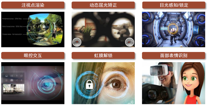 目前VR頭顯設(shè)備交互技術(shù)主要有手勢(shì)識(shí)別、語(yǔ)音識(shí)別、眼動(dòng)追蹤、腦機(jī)接口、控制手柄等,其中眼動(dòng)追蹤是最重要的交互方式之一。隨著消費(fèi)者對(duì)VR體驗(yàn)要求的不斷提高,眼動(dòng)追蹤開(kāi)始由早期的外設(shè)配件逐步發(fā)展成為VR的集成配置,并逐漸在消費(fèi)級(jí)設(shè)備上實(shí)現(xiàn)搭載。中金認(rèn)為,眼動(dòng)追蹤方案未來(lái)有望在VR設(shè)備中實(shí)現(xiàn)普及。中金認(rèn)為眼動(dòng)追蹤技術(shù)在VR中主要運(yùn)用于:注視點(diǎn)渲染、屈光度校正、眼控交互、目標(biāo)識(shí)別、虹膜識(shí)別等場(chǎng)景。