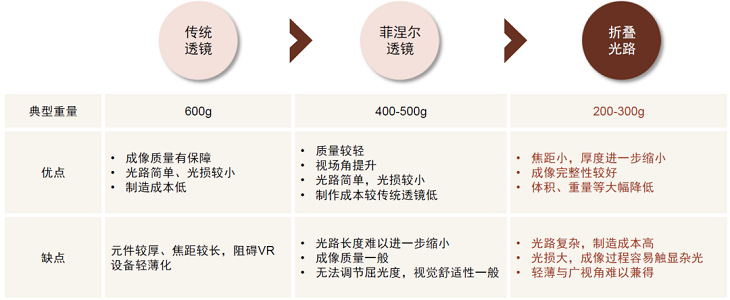 VR硬件輕薄化助推光學(xué)器件不斷升級(jí)。由于傳統(tǒng)透鏡存在小焦距和薄鏡片的矛盾,因而采用傳統(tǒng)透鏡的VR設(shè)備受制于體積和重量,不利于用戶(hù)長(zhǎng)時(shí)間佩戴。為實(shí)現(xiàn)VR硬件輕薄化,目前VR設(shè)備普遍采用菲涅爾透鏡方案,并向折疊光路方案持續(xù)升級(jí)突破。