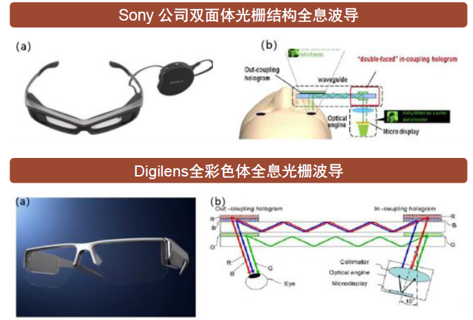 體全息光波導(dǎo)方案是通過(guò)采用體全息光柵(VHG)作為光波導(dǎo)模組中的耦合器對(duì)光束進(jìn)行調(diào)節(jié)。采用體全息光波導(dǎo)方案的代表性廠家為Sony和Digilens,其中,Sony已推出高亮度的單綠色體全息光波導(dǎo)(已停產(chǎn)),Digilens已推出雙層全彩體全息光波導(dǎo),有效減少色散但效率不高且雙層結(jié)構(gòu)制造難度大。體全息光柵在滿(mǎn)足特殊要求情況下,理論上成像效果更好,衍射效率可以達(dá)到100%。而在實(shí)際應(yīng)用中,由于受可利用材料的限制,體全息光波導(dǎo)目前在FOV、光效率、清晰度等方面都尚未達(dá)到表面浮雕光波導(dǎo)同等的水平。但是由于它在設(shè)計(jì)壁壘、工藝難度和制造成本上具有一定優(yōu)勢(shì),因而業(yè)內(nèi)仍持續(xù)對(duì)該技術(shù)進(jìn)行研發(fā)和探索。