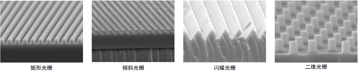 表面浮雕光波導(dǎo)方案,是采用表面浮雕光柵(SRG)替代傳統(tǒng)的折反射光學(xué)元件,作為光波導(dǎo)模組中的耦合器對(duì)光束進(jìn)行調(diào)節(jié)。表面浮雕光柵,指的是玻璃基底表面上規(guī)律性的凹槽。根據(jù)凹槽的輪廓、形狀等的不同,可以將表面浮雕光柵分為一維光柵與二維光柵。其中,一維光柵根據(jù)橫截面形狀不同,可進(jìn)一步劃分為矩形光柵、閃耀光柵和傾斜光柵等,二維光柵常用的結(jié)構(gòu)是六邊形分布的圓柱狀光柵。