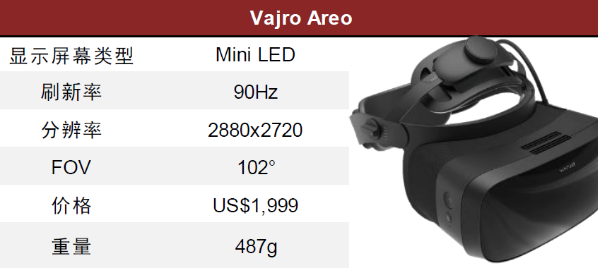 折疊光路催生顯示方案升級(jí),Mini LED背光成本優(yōu)勢(shì)明顯。Mini LED背光相較于傳統(tǒng)LED背光源優(yōu)點(diǎn)較為突出:1)結(jié)合精細(xì)的Local Dimming,實(shí)現(xiàn)更高對(duì)比度;2)縮短光學(xué)混光距離(OD),降低整機(jī)厚度實(shí)現(xiàn)超薄化;3)顯示屏亮度大幅度提高。2022年1月,Vajro發(fā)布了首款采用Mini LED背光的VR頭顯設(shè)備Vajro Areo,可實(shí)現(xiàn)單眼分辨率2880×2720,售價(jià)為1,999美元。中金認(rèn)為,相比Micro OLED,Mini LED背光依托成熟LCD生產(chǎn),在成本端具備較強(qiáng)競(jìng)爭(zhēng)力,且顯示效果及亮度相比傳統(tǒng)LCD或OLED均有明顯改善。