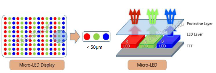 Micro LED,即LED微縮技術(shù),是指將傳統(tǒng)LED陣列化、徽縮化后定址巨量轉(zhuǎn)移到電路基板上,形成超小間距LED。該技術(shù)將毫米級(jí)別的LED進(jìn)一步微縮到微米級(jí)(50μm左右,傳統(tǒng)LED的1%)。由于Micro LED具備尺寸小、集成度高和自發(fā)光等特點(diǎn)相比LCD/OLED在亮度、能耗、壽命和響應(yīng)速度等方面具有明顯優(yōu)勢(shì)。此外,Micro LED不需要大面積的基板進(jìn)行光刻或蒸發(fā),也不需要復(fù)雜的過(guò)程進(jìn)行顏色轉(zhuǎn)換和防止亮度降低。因此,理論上Micro LED系統(tǒng)成本更低。長(zhǎng)期來(lái)看,中金認(rèn)為Micro LED有望成為下一代主流顯示技術(shù)方案。