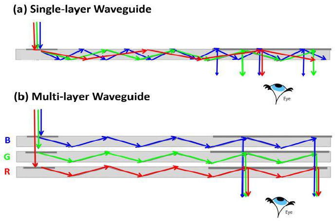 單層光波導(dǎo)和光柵會(huì)引起出射光的“彩虹效應(yīng)”。衍射物理過(guò)程本身對(duì)于角度和波長(zhǎng)的選擇性導(dǎo)致了色散問(wèn)題的存在:一方面,同一個(gè)衍射光柵對(duì)于不同的波長(zhǎng)會(huì)對(duì)應(yīng)不同的衍射角度;另一方面,即便是同一顏色的衍射效率,也取決于入射角而發(fā)生變化,這樣的差異導(dǎo)致FOV和動(dòng)眼框內(nèi)的顏色不均勻,即出現(xiàn)“彩虹效應(yīng)”。