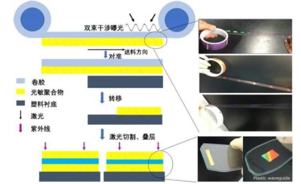 為實(shí)現(xiàn)體全息光波導(dǎo)的大批量生產(chǎn),以Sony和Digilens為代表的公司開(kāi)發(fā)了體全息光波導(dǎo)的加工工藝流程。其中,為降低大規(guī)模批量生產(chǎn)的加工成本,Sony開(kāi)發(fā)了制備體全息光波導(dǎo)的卷對(duì)卷(roll-to-roll)工藝,并且為降低難度以及減少色散效應(yīng),卷對(duì)卷工藝中采用雙層光柵設(shè)計(jì),即綠光波導(dǎo)片和紅藍(lán)光波導(dǎo)片。此外,為進(jìn)一步提高生產(chǎn)效率,Digilens開(kāi)發(fā)了體全息光波導(dǎo)印刷工藝。